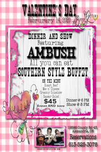 Sortez du froid et venez vous réchauffer à notre événement de la Saint-Valentin. Souper buffet ‘Southern’ et spectacle pour seulement 45 $
